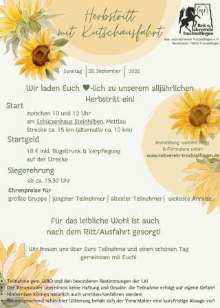 Hiermit laden wir euch recht herzlich zu unserem diesjährigen Herbstritt mit Kutschausfahrt ein. Alle Informationen findet Ihr in dem beigefügten Dokument.