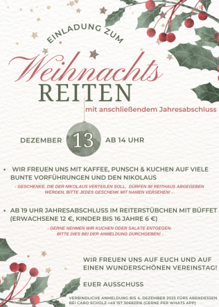 | 13. Dezember | Weihnachtsreiten mit Jahresabschluss |